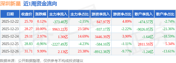 资金流向数据方面,本周深圳新星主力资金合计净流入4.17亿元,游资资金合计净流出6139.29万元,散户资金合计净流出3.55亿元。本周资金流向一览见下表: