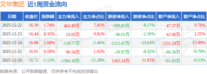 资金流向数据方面,本周艾华集团主力资金合计净流出831.08万元,游资资金合计净流出383.07万元,散户资金合计净流入1214.15万元。本周资金流向一览见下表: