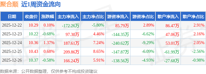 资金流向数据方面,本周聚合顺主力资金合计净流入488.75万元,游资资金合计净流出585.61万元,散户资金合计净流入96.86万元。本周资金流向一览见下表: