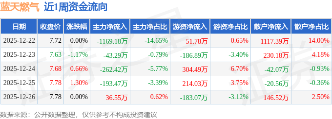 沪深股通持股方面,截止2025年12月26日收盘,蓝天燃气沪股通持股数为869.43万股,占流通股比为134.0%。