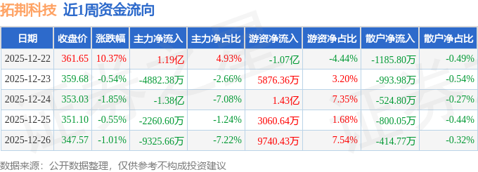 沪深股通持股方面,截止2025年12月26日收盘,拓荆科技沪股通持股数为367.63万股,占流通股比为239.0%。