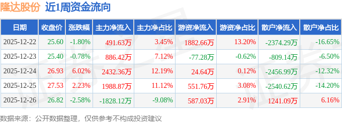 资金流向数据方面,本周隆达股份主力资金合计净流入3971.15万元,游资资金合计净流入2968.81万元,散户资金合计净流出6939.96万元。本周资金流向一览见下表: