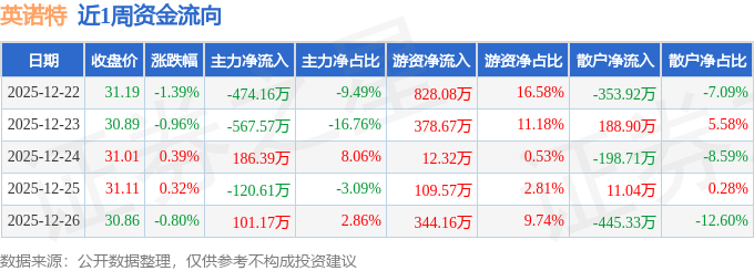 资金流向数据方面,本周英诺特主力资金合计净流出874.78万元,游资资金合计净流入1672.79万元,散户资金合计净流出798.02万元。本周资金流向一览见下表: