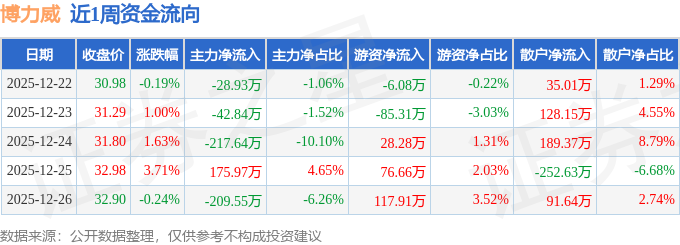 资金流向数据方面,本周博力威主力资金合计净流出322.99万元,游资资金合计净流入131.46万元,散户资金合计净流入191.53万元。本周资金流向一览见下表: