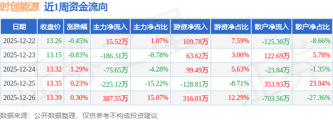 资金流向数据方面,本周时创能源主力资金合计净流出84.01万元,游资资金合计净流入460.09万元,散户资金合计净流出376.08万元。本周资金流向一览见下表: