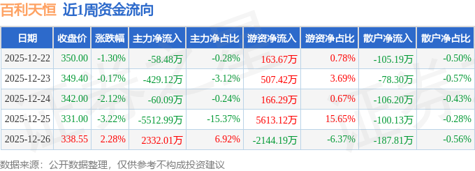 资金流向数据方面,本周百利天恒主力资金合计净流出3728.67万元,游资资金合计净流入4306.3万元,散户资金合计净流出577.63万元。本周资金流向一览见下表: