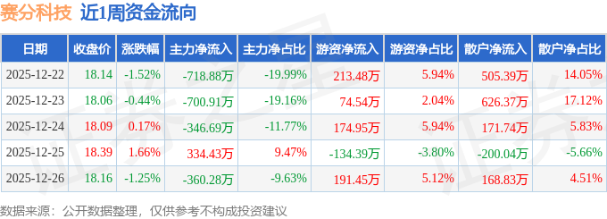 资金流向数据方面,本周赛分科技主力资金合计净流出1792.32万元,游资资金合计净流入520.03万元,散户资金合计净流入1272.29万元。本周资金流向一览见下表: