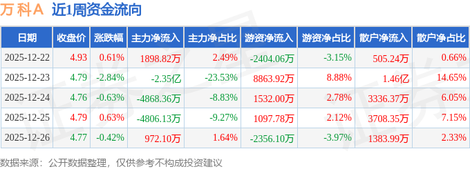 沪深股通持股方面,截止2025年12月26日收盘,万 科A深股通持股数为1.88亿股,占流通股比为193.0%。
