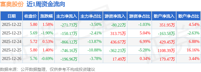 资金流向数据方面,本周富奥股份主力资金合计净流出2231.13万元,游资资金合计净流入325.46万元,散户资金合计净流入1905.67万元。本周资金流向一览见下表: