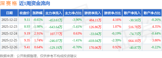 资金流向数据方面,本周深 赛 格主力资金合计净流出1364.73万元,游资资金合计净流入329.95万元,散户资金合计净流入1034.79万元。本周资金流向一览见下表: