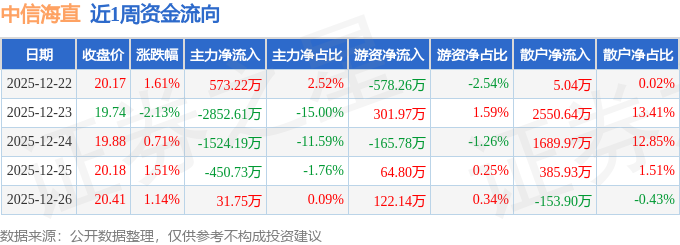 资金流向数据方面,本周中信海直主力资金合计净流出4222.56万元,游资资金合计净流出255.12万元,散户资金合计净流入4477.68万元。本周资金流向一览见下表: