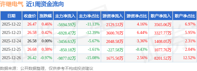 沪深股通持股方面,截止2025年12月26日收盘,许继电气深股通持股数为8473.93万股,占流通股比为840.0%。