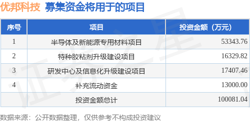 证券之星消息,东莞优邦材料科技股份有限公司(简称:优邦科技)拟在深交所创业板上市,募资总金额为10.01亿元,保荐机构为申万宏源证券承销保荐有限责任公司。募集资金拟用于半导体及新能源专用材料项目、特种胶粘剂升级建设项目、研发中心及信息化升级建设项目、补充流动资金,详见下表: