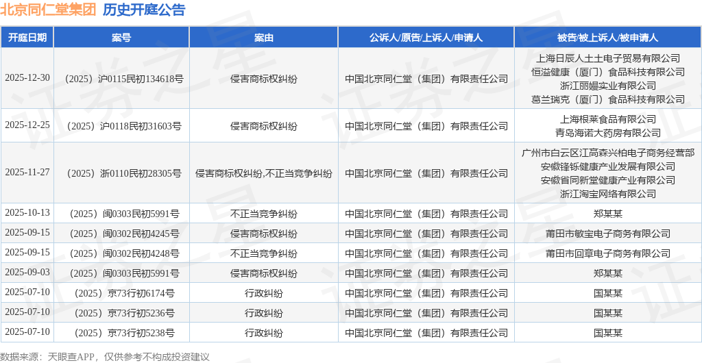 案号:(2025)沪0115民初134618号根据统计,近一年内以中国北京同仁堂(集团)有限责任公司为当事人的历史开庭公告有10则,其中案由为“侵害商标权纠纷”的公告以4则居首,其次为“行政纠纷”有3则,“不正当竞争纠纷”有2则。历史开庭公告如下: