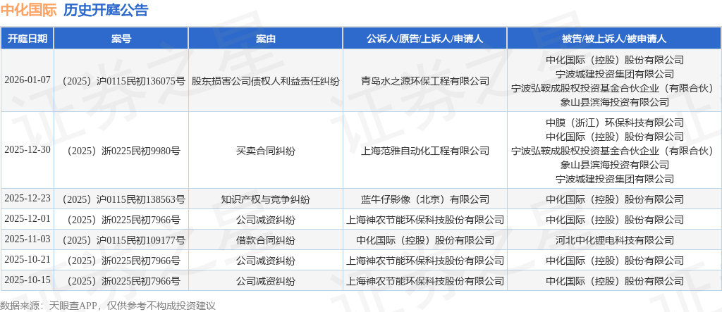 案号:(2025)浙0225民初9980号根据统计,近一年内以中化国际(控股)股份有限公司为当事人的历史开庭公告有7则,其中案由为“公司减资纠纷”的公告以3则居首,其次为“买卖合同纠纷”有1则,“借款合同纠纷”有1则。历史开庭公告如下: