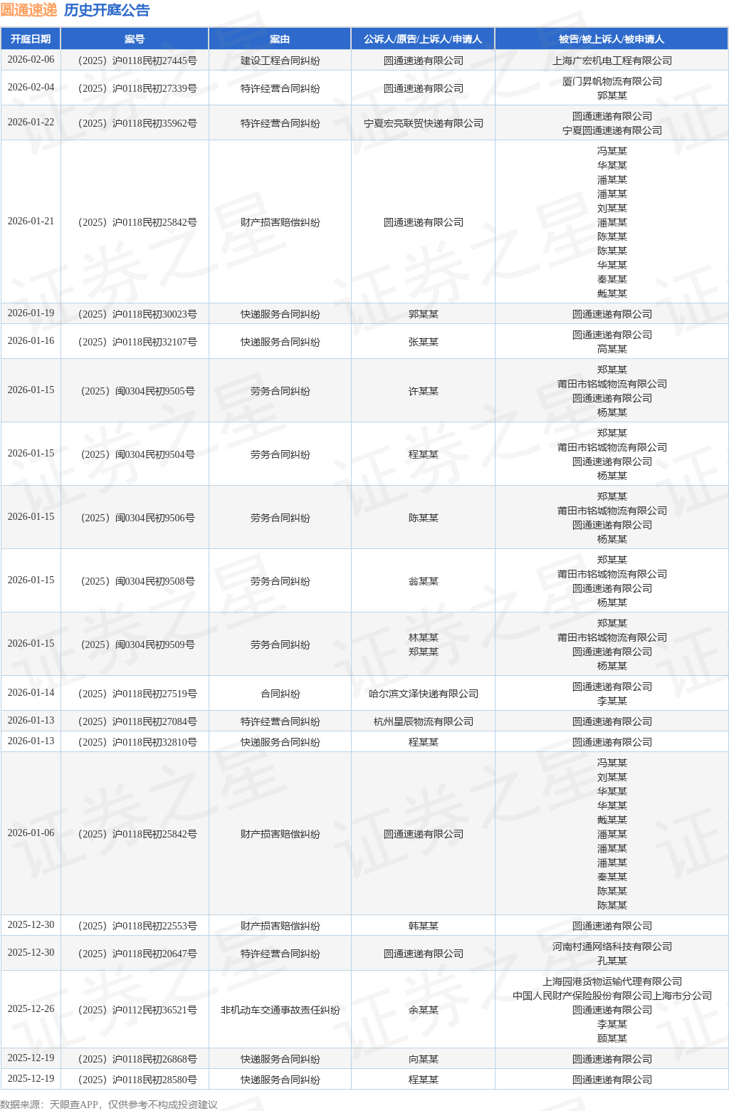 案号:(2025)沪0118民初22553号根据统计,近一年内以圆通速递有限公司为当事人的历史开庭公告有168则,其中案由为“快递服务合同纠纷”的公告以40则居首,其次为“特许经营合同纠纷”有24则,“非机动车交通事故责任纠纷”有16则。历史开庭公告(前20条)如下: