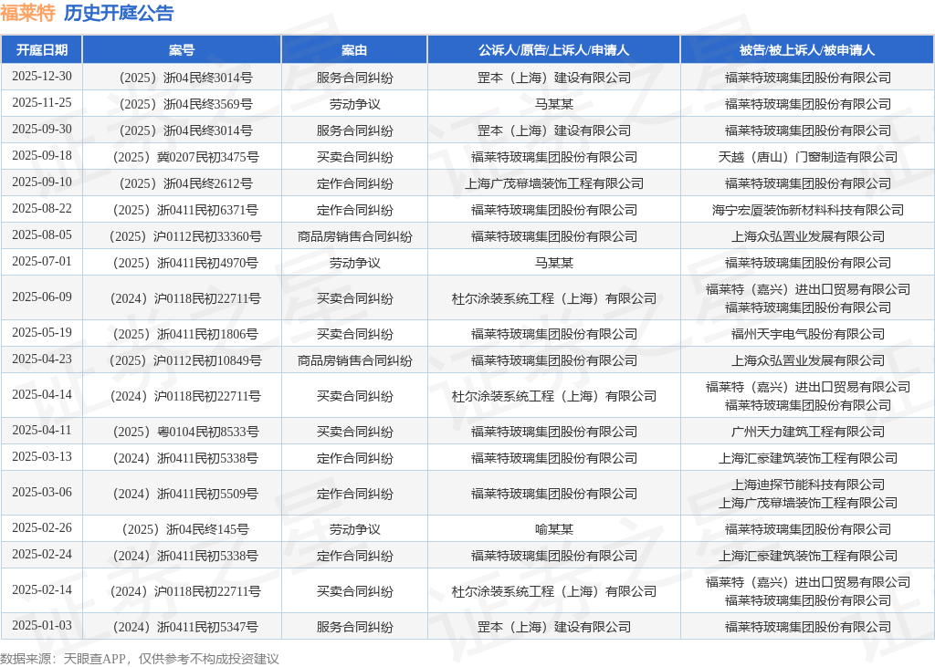 案号:(2025)浙04民终3014号根据统计,近一年内以福莱特玻璃集团股份有限公司为当事人的历史开庭公告有19则,其中案由为“买卖合同纠纷”的公告以6则居首,其次为“定作合同纠纷”有5则,“劳动争议”有3则。历史开庭公告如下: