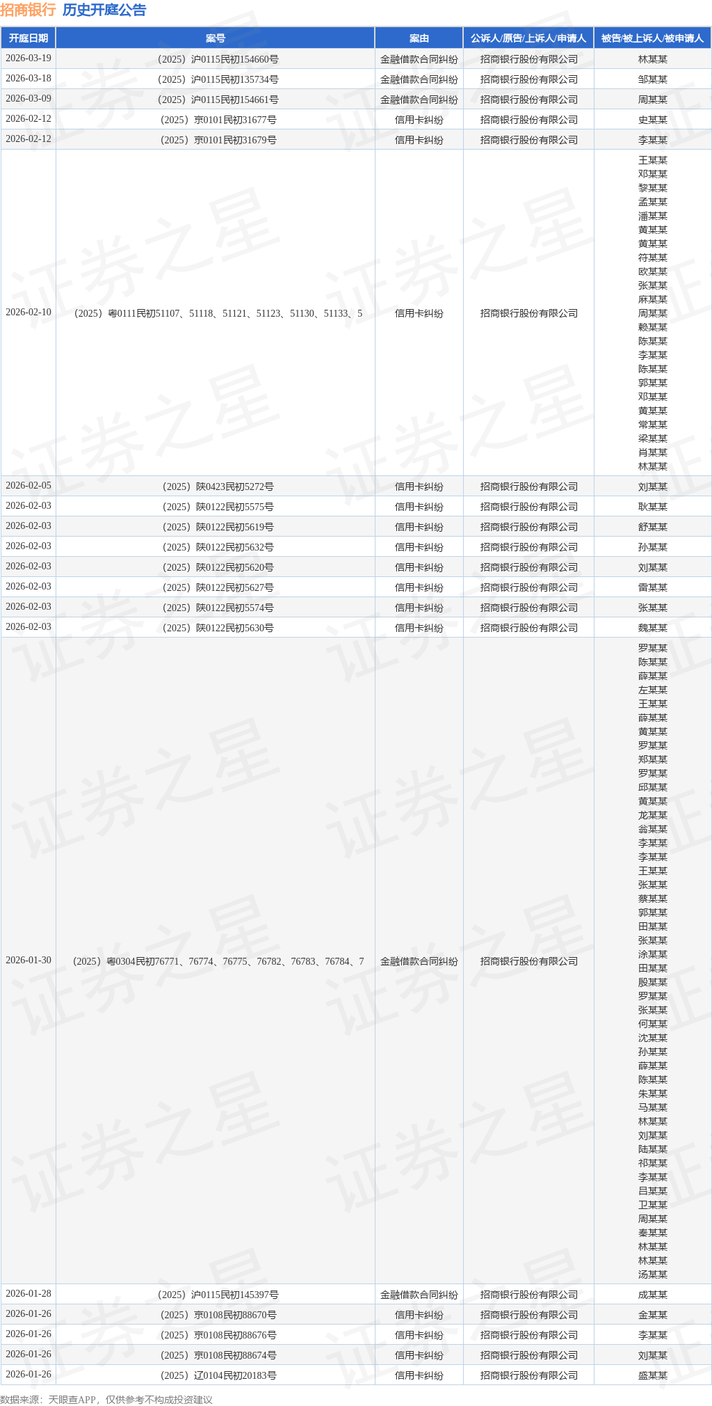 案号:(2025)辽0103民初13478号根据统计,近一年内以招商银行股份有限公司为当事人的历史开庭公告有886则,其中案由为“信用卡纠纷”的公告以463则居首,其次为“金融借款合同纠纷”有348则,“借款合同纠纷”有37则。历史开庭公告(前20条)如下: