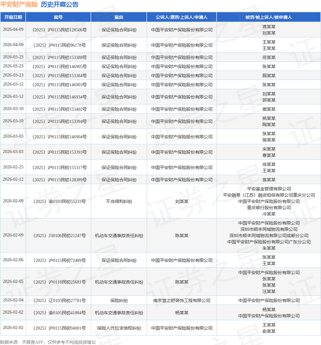 案号:(2025)粤0106民初34286号根据统计,近一年内以中国平安财产保险股份有限公司为当事人的历史开庭公告有2025则,其中案由为“机动车交通事故责任纠纷”的公告以973则居首,其次为“保证保险合同纠纷”有261则,“保险人代位求偿权纠纷”有170则。历史开庭公告(前20条)如下: