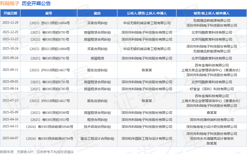 案号:(2025)苏0213民初14904号根据统计,近一年内以深圳市科陆电子科技股份有限公司为当事人的历史开庭公告有13则,其中案由为“房屋租赁合同纠纷”的公告以5则居首,其次为“买卖合同纠纷”有2则,“股东出资纠纷”有2则。历史开庭公告如下: