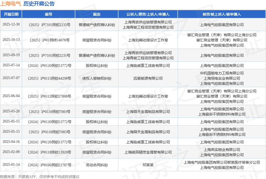 案号:(2025)沪7101民初2235号根据统计,近一年内以上海电气控股集团有限公司为当事人的历史开庭公告有12则,其中案由为“房屋租赁合同纠纷”的公告以5则居首,其次为“股权转让纠纷”有3则,“普通破产债权确认纠纷”有2则。历史开庭公告如下:
