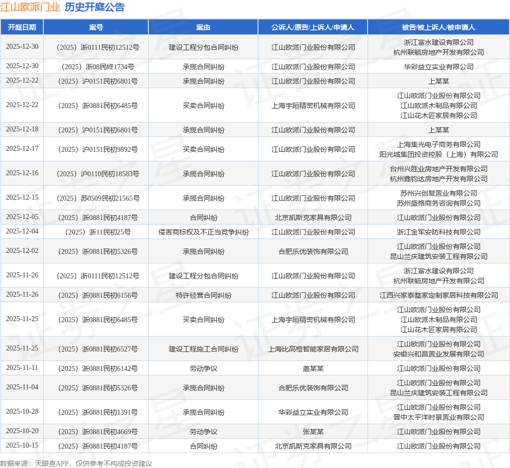 案号:(2025)浙0111民初12512号根据统计,近一年内以江山欧派门业股份有限公司为当事人的历史开庭公告有106则,其中案由为“承揽合同纠纷”的公告以36则居首,其次为“买卖合同纠纷”有22则,“劳动争议”有11则。历史开庭公告(前20条)如下: