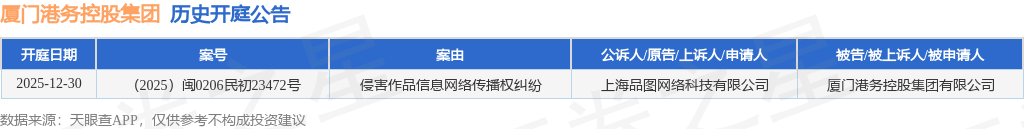 根据统计,近一年内以厦门港务控股集团有限公司为当事人的历史开庭公告有1则,其中案由为“侵害作品信息网络传播权纠纷”的公告以1则居首。历史开庭公告如下: