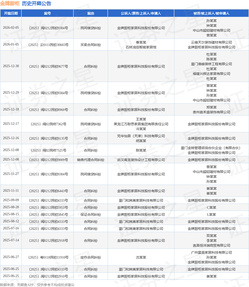 案号:(2025)闽0212民初9677号根据统计,近一年内以金牌厨柜家居科技股份有限公司为当事人的历史开庭公告有30则,其中案由为“合同纠纷”的公告以16则居首,其次为“定作合同纠纷”有4则,“民间借贷纠纷”有4则。历史开庭公告(前20条)如下: