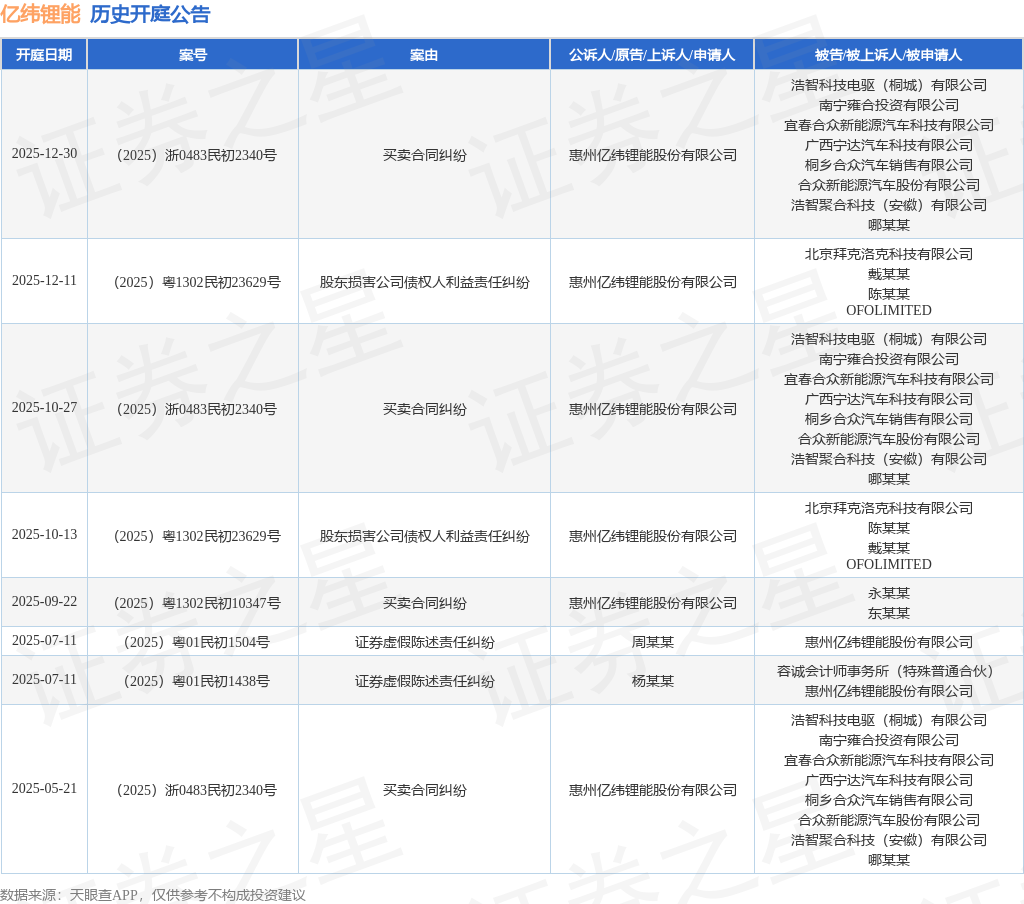 案号:(2025)浙0483民初2340号根据统计,近一年内以惠州亿纬锂能股份有限公司为当事人的历史开庭公告有8则,其中案由为“买卖合同纠纷”的公告以4则居首,其次为“股东损害公司债权人利益责任纠纷”有2则,“证券虚假陈述责任纠纷”有2则。历史开庭公告如下: