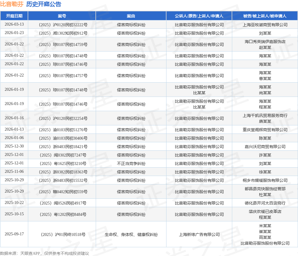 案号:(2025)浙0483民初18421号根据统计,近一年内以比音勒芬服饰股份有限公司为当事人的历史开庭公告有67则,其中案由为“侵害商标权纠纷”的公告以42则居首,其次为“不正当竞争纠纷”有13则,“商标权权属、侵权纠纷”有4则。历史开庭公告(前20条)如下: