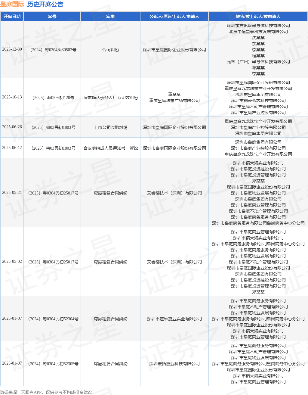 案号:(2024)粤0304执30582号根据统计,近一年内以深圳市皇庭国际企业股份有限公司为当事人的历史开庭公告有8则,其中案由为“房屋租赁合同纠纷”的公告以4则居首,其次为“上市公司收购纠纷”有1则,“合同纠纷”有1则。历史开庭公告如下: