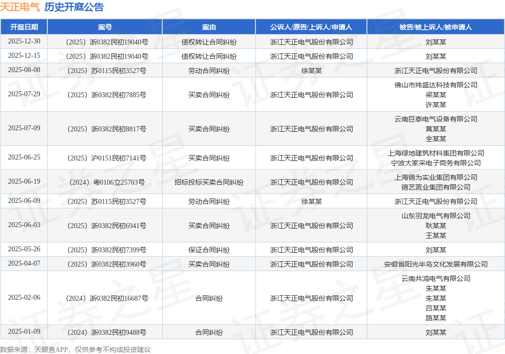案号:(2025)浙0382民初19040号根据统计,近一年内以浙江天正电气股份有限公司为当事人的历史开庭公告有13则,其中案由为“买卖合同纠纷”的公告以5则居首,其次为“债权转让合同纠纷”有2则,“劳动合同纠纷”有2则。历史开庭公告如下: