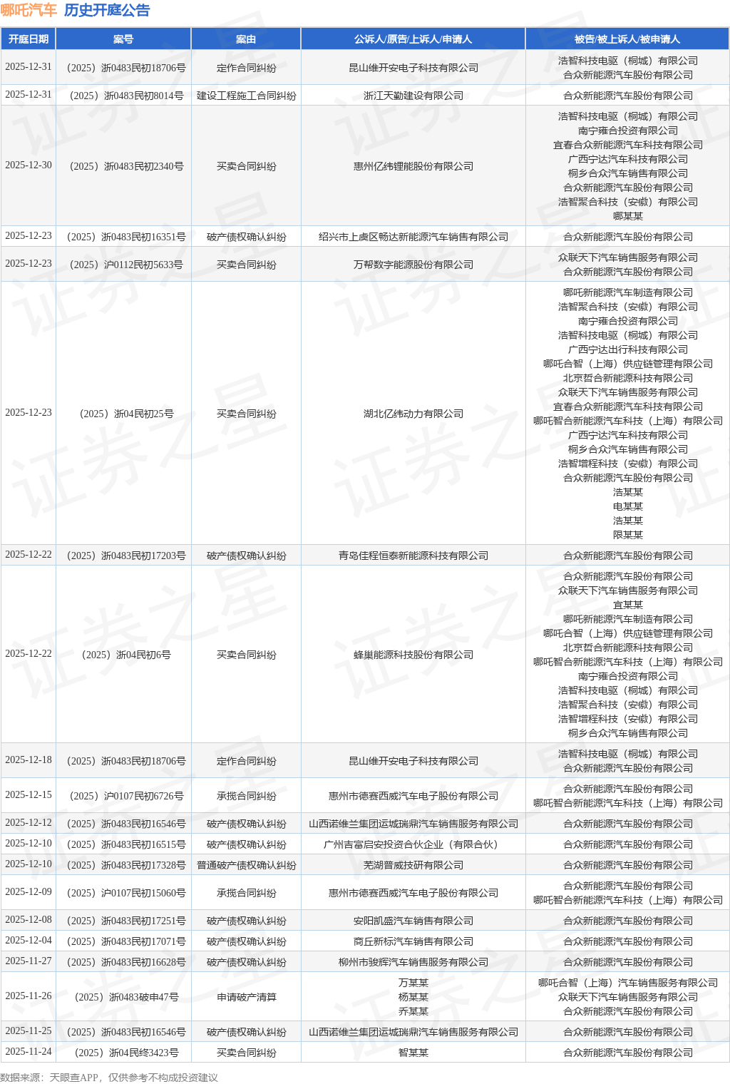 案号:(2025)浙0483民初2340号根据统计,近一年内以合众新能源汽车股份有限公司为当事人的历史开庭公告有403则,其中案由为“买卖合同纠纷”的公告以156则居首,其次为“合同纠纷”有49则,“服务合同纠纷”有49则。历史开庭公告(前20条)如下: