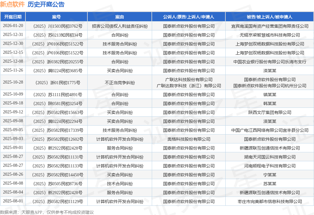 案号:(2025)沪0106民初51522号根据统计,近一年内以国泰新点软件股份有限公司为当事人的历史开庭公告有103则,其中案由为“计算机软件开发合同纠纷”的公告以49则居首,其次为“买卖合同纠纷”有16则,“技术服务合同纠纷”有16则。历史开庭公告(前20条)如下: