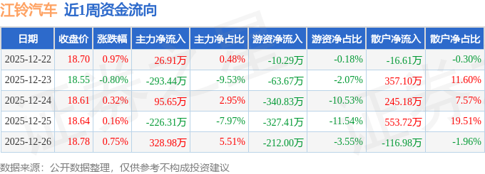 沪深股通持股方面,截止2025年12月26日收盘,江铃汽车深股通持股数为1864.65万股,占流通股比为360.0%。