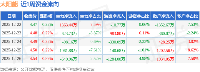 沪深股通持股方面,截止2025年12月26日收盘,太阳能深股通持股数为3418.9万股,占流通股比为95.0%。