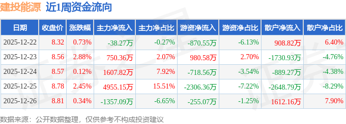 资金流向数据方面,本周建投能源主力资金合计净流入5917.97万元,游资资金合计净流出3169.97万元,散户资金合计净流出2748.0万元。本周资金流向一览见下表: