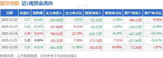 资金流向数据方面,本周顺发恒能主力资金合计净流入362.78万元,游资资金合计净流入200.37万元,散户资金合计净流出563.15万元。本周资金流向一览见下表: