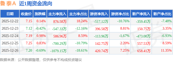 资金流向数据方面,本周鲁 泰A主力资金合计净流出863.23万元,游资资金合计净流入328.99万元,散户资金合计净流入534.24万元。本周资金流向一览见下表: