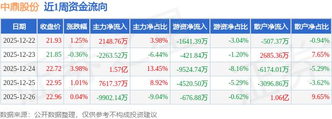 资金流向数据方面,本周中鼎股份主力资金合计净流入1.33亿元,游资资金合计净流出1.68亿元,散户资金合计净流入3486.13万元。本周资金流向一览见下表: