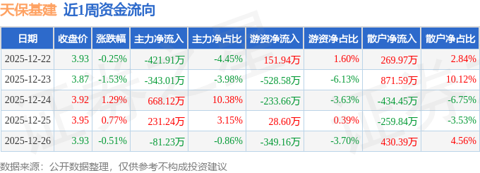 资金流向数据方面,本周天保基建主力资金合计净流入53.2万元,游资资金合计净流出930.86万元,散户资金合计净流入877.66万元。本周资金流向一览见下表: