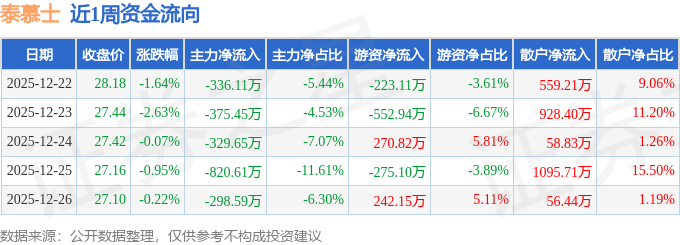 资金流向数据方面,本周泰慕士主力资金合计净流出2160.41万元,游资资金合计净流出538.18万元,散户资金合计净流入2698.58万元。本周资金流向一览见下表: