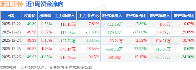 资金流向数据方面,本周浙江正特主力资金合计净流入731.8万元,游资资金合计净流出536.81万元,散户资金合计净流出194.99万元。本周资金流向一览见下表: