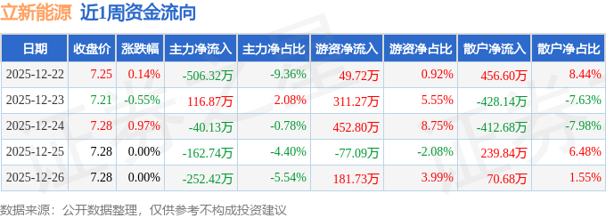 资金流向数据方面,本周立新能源主力资金合计净流出844.74万元,游资资金合计净流入918.43万元,散户资金合计净流出73.69万元。本周资金流向一览见下表: