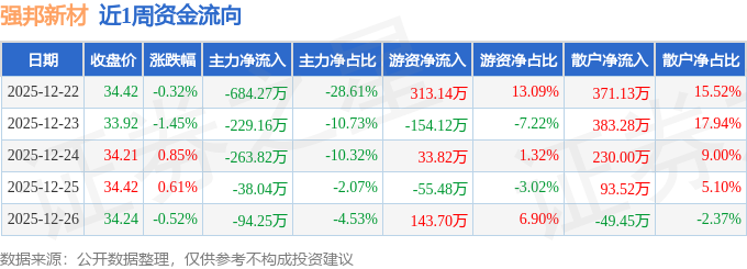 资金流向数据方面,本周强邦新材主力资金合计净流出1309.53万元,游资资金合计净流入281.06万元,散户资金合计净流入1028.48万元。本周资金流向一览见下表: