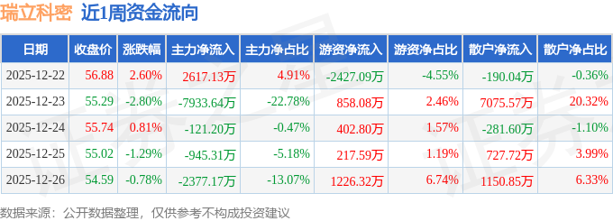 资金流向数据方面,本周瑞立科密主力资金合计净流出8760.19万元,游资资金合计净流入277.7万元,散户资金合计净流入8482.49万元。本周资金流向一览见下表: