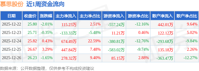 沪深股通持股方面,截止2025年12月26日收盘,慕思股份深股通持股数为43.44万股,占流通股比为56.0%。