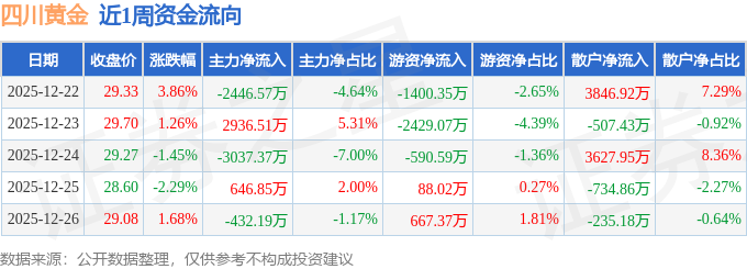 资金流向数据方面,本周四川黄金主力资金合计净流出2332.77万元,游资资金合计净流出3664.63万元,散户资金合计净流入5997.4万元。本周资金流向一览见下表:
