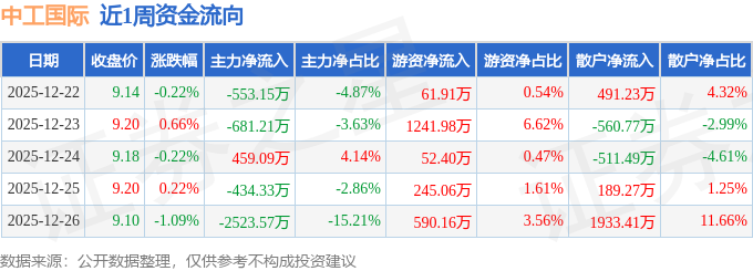 资金流向数据方面,本周中工国际主力资金合计净流出3733.17万元,游资资金合计净流入2191.52万元,散户资金合计净流入1541.65万元。本周资金流向一览见下表: