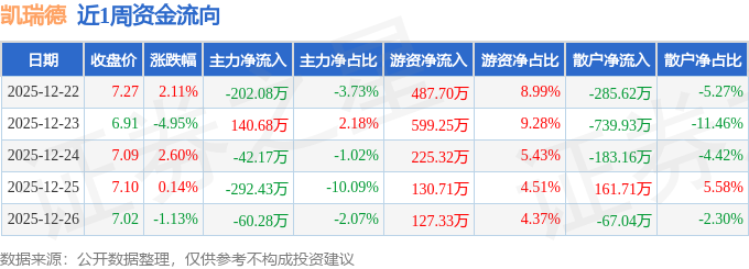 资金流向数据方面,本周凯瑞德主力资金合计净流出456.28万元,游资资金合计净流入1570.32万元,散户资金合计净流出1114.04万元。本周资金流向一览见下表: